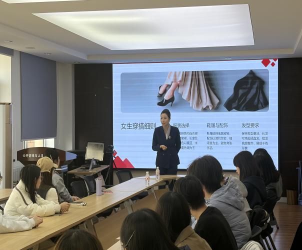 培训会上,肖茹月老师结合多年行业经验与专业资质,从形象管理的核心价值切入,系统讲解妆容打造、仪态塑造与审美提升的实用方法。她指出,得体的形象不仅是外在表达,更是内在自信与修养的体现,有助于学子在校园生活、人际交往与各类场合中展现从容姿态。